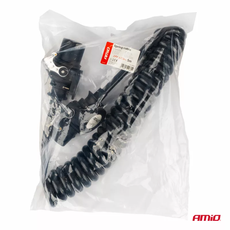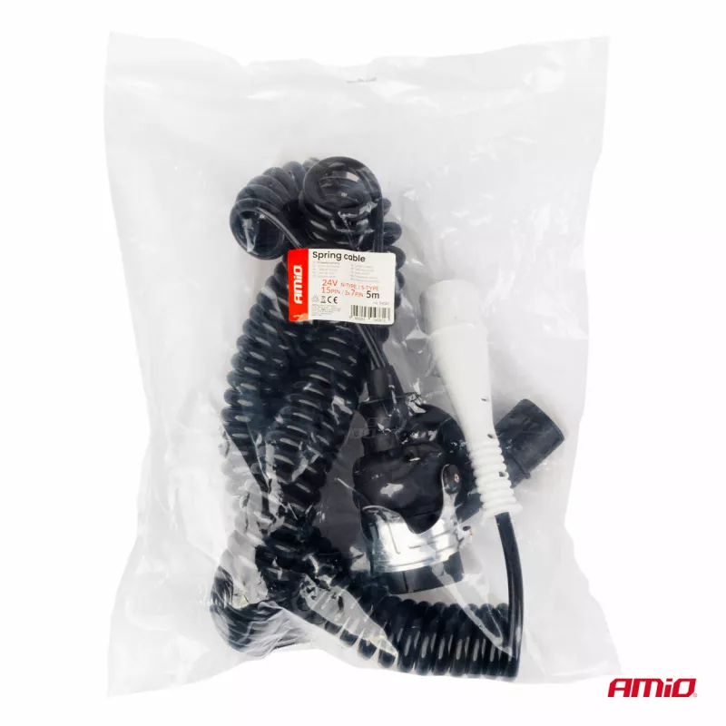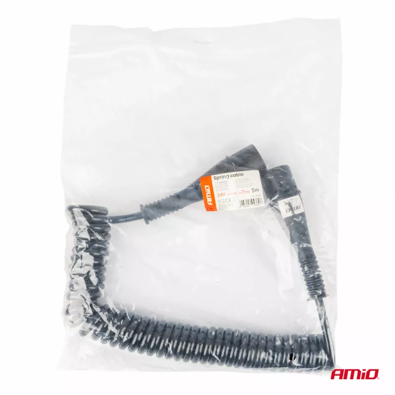 Spécifications : 2x fiche 7 PIN (type N), tension 24V, longueur spiralée 5 m, usage pour connexion électrique tracteur-remorque